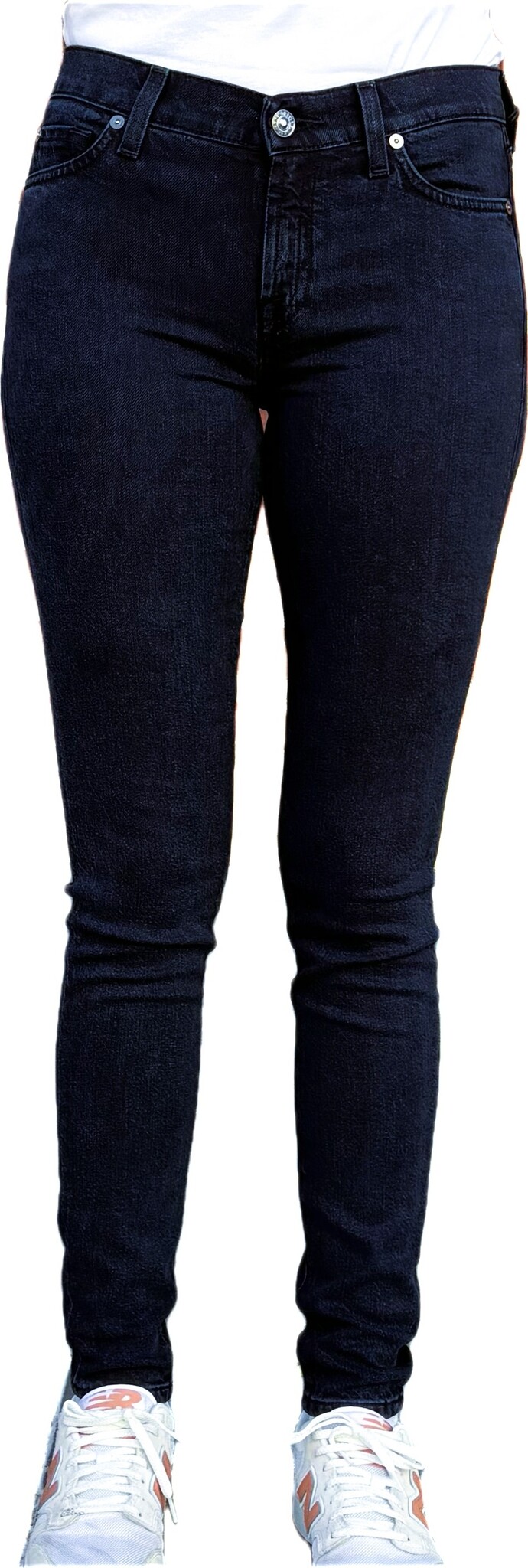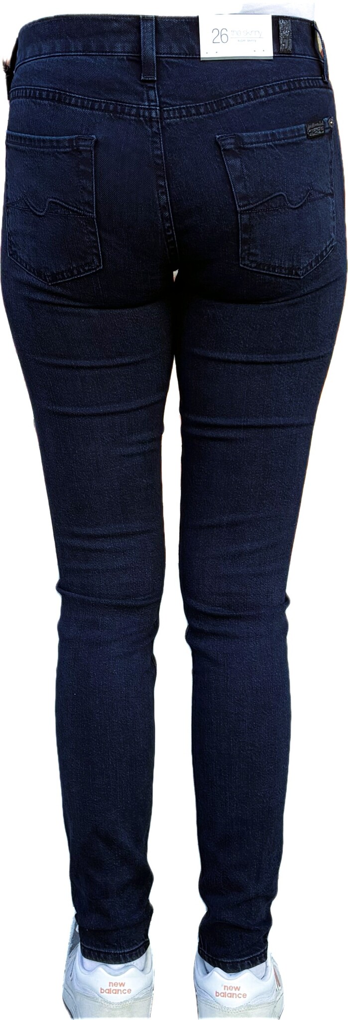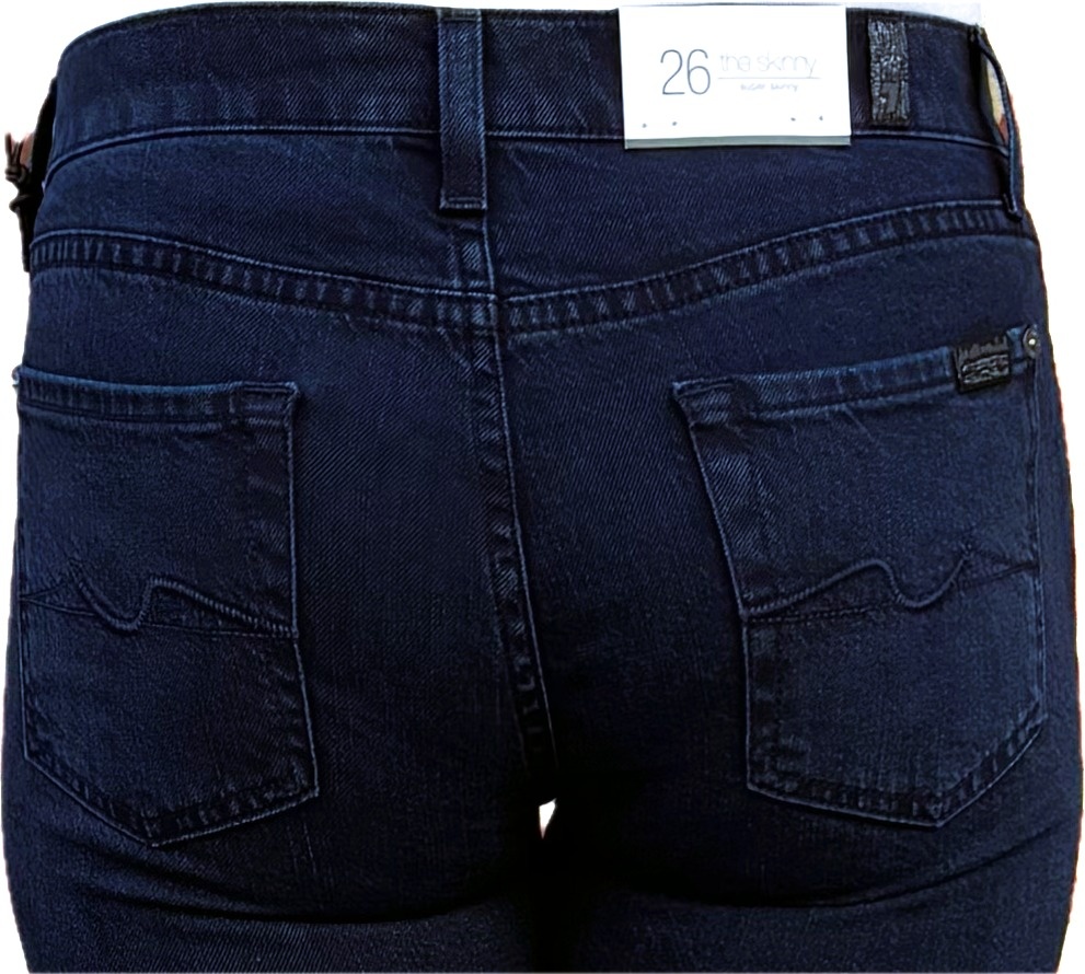 De kenmerkende 7 For All Mankind ‘squiggle’ stiksels op de achterzakken en enkellange skinny pijpen.
